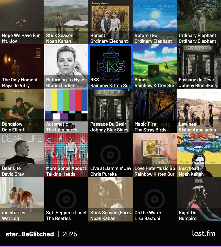 2025 Albums. Brandi Carlile - Returning To Myself, Mt. Joy - Hope We Have Fun, Ocie Elliott - Bungalow, Panda Bear - Sinister Grift.